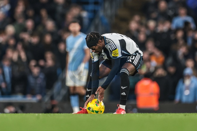 Anthony Elanga of Newcastle Untied returns the ball to the centre spot after scoring to make it 3-1 (5-1) during the Carabao Cup Semi-Final second leg match Manchester City vs Newcastle United at Etihad Stadium, Manchester, United Kingdom, 4th February 2026, Credit:Mark Cosgrove/News Images / Avalon