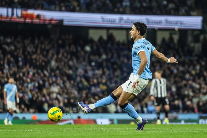 Omar Marmoush of Manchester City shoots on goal during the Carabao Cup Semi-Final second leg match Manchester City vs Newcastle United at Etihad Stadium, Manchester, United Kingdom, 4th February 2026, Credit:Mark Cosgrove/News Images / Avalon