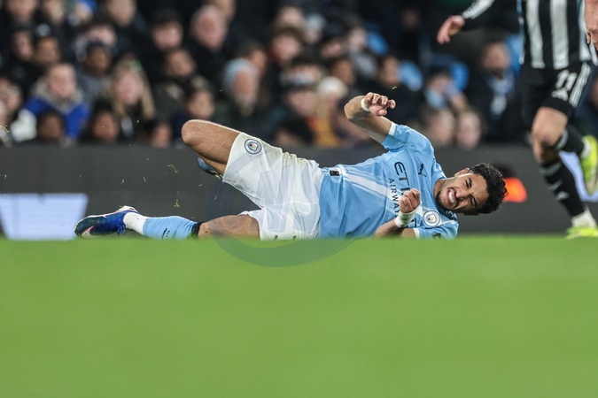 Omar Marmoush of Manchester City hurts himself after taking a shot on goal during the Carabao Cup Semi-Final second leg match Manchester City vs Newcastle United at Etihad Stadium, Manchester, United Kingdom, 4th February 2026, Credit:Mark Cosgrove/News Images / Avalon