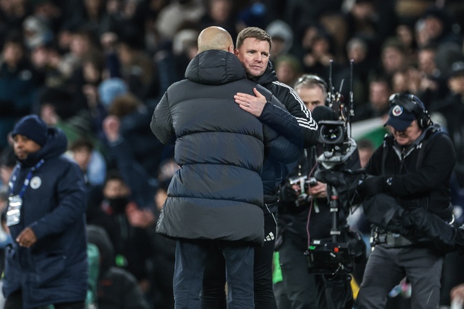 Pep Guardiola manager of Manchester City and Eddie Howe manager of Newcastle United shake hands after the game during the Carabao Cup Semi-Final second leg match Manchester City vs Newcastle United at Etihad Stadium, Manchester, United Kingdom, 4th February 2026, Credit:Mark Cosgrove/News Images / Avalon