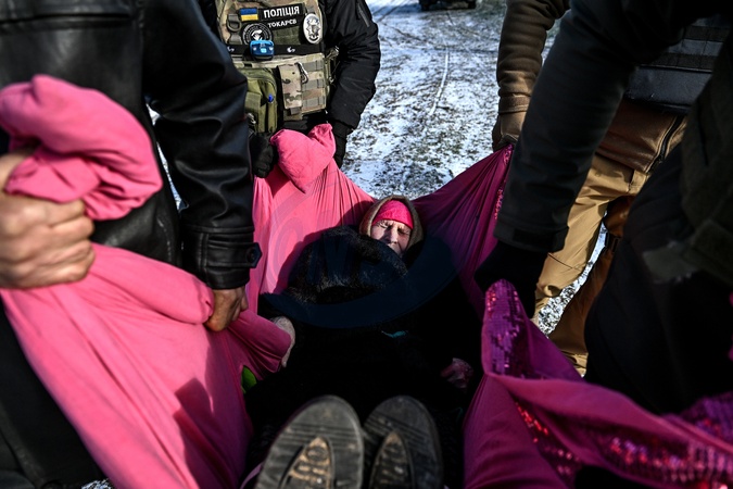 Police officers carry an elderly woman, Neonila Dmytrivna, in a blanket during the evacuation from front-line Yurkivka village, Zaporizhzhia region, Ukraine, February 3, 2026., Credit:Dmytro Smolienko / Avalon