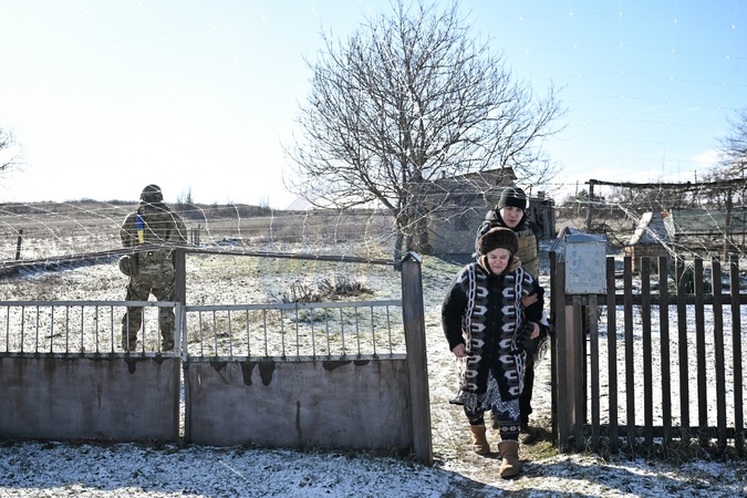 A volunteer helps an elderly woman reach a vehicle during the evacuation from front-line Tavriiske village, Zaporizhzhia region, Ukraine, February 3, 2026., Credit:Dmytro Smolienko / Avalon
