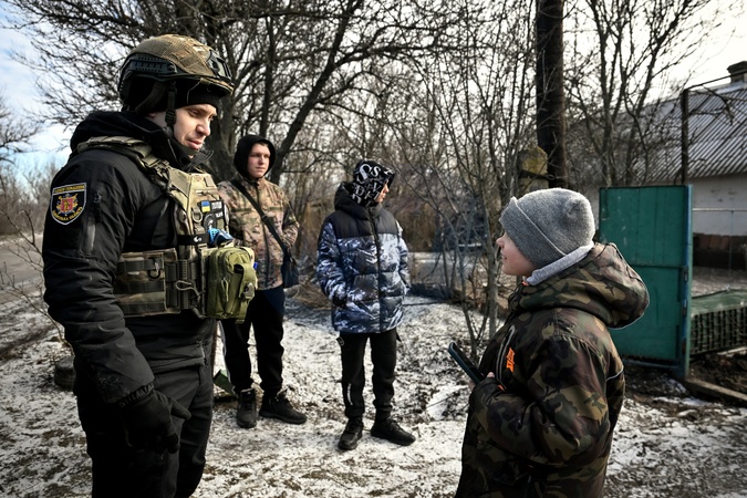 A police officer talks to a boy during the evacuation from front-line Tavriiske village, Zaporizhzhia region, Ukraine, February 3, 2026., Credit:Dmytro Smolienko / Avalon