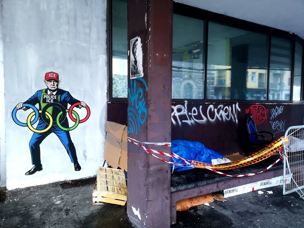February 5, 2026, Milan. Artist aleXsandro Palombo has created a mural of US President Donald Trump. The former president is portrayed in his iconic blue suit, a bulletproof vest with the words POLICE ICE written on it, and his famous red ICE cap, clutching the five Olympic rings. The mural was created at the Bastioni di Porta Volta, on the historic ATM shelter, now disused., Credit:Press Office / Avalon