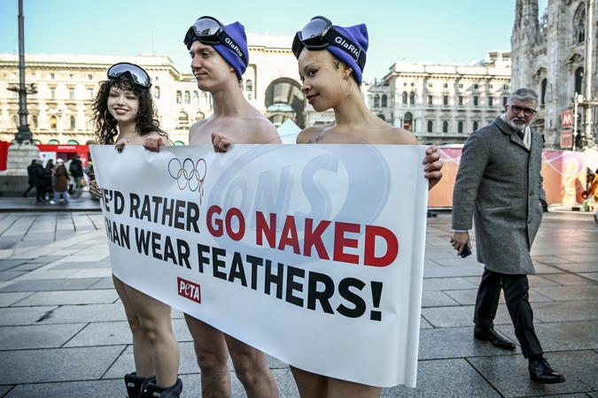February 5, 2026, Milan. Piazza Duomo. Better Naked Than Wear Feathers, PETA's protest before the Olympics. A trio of nearly naked PETA supporters—wearing only hats, ski goggles, and snow boots—stand behind a banner reading "We'd Rather Go Naked Than Wear Feathers!", Credit:Nicola Marfisi / Avalon