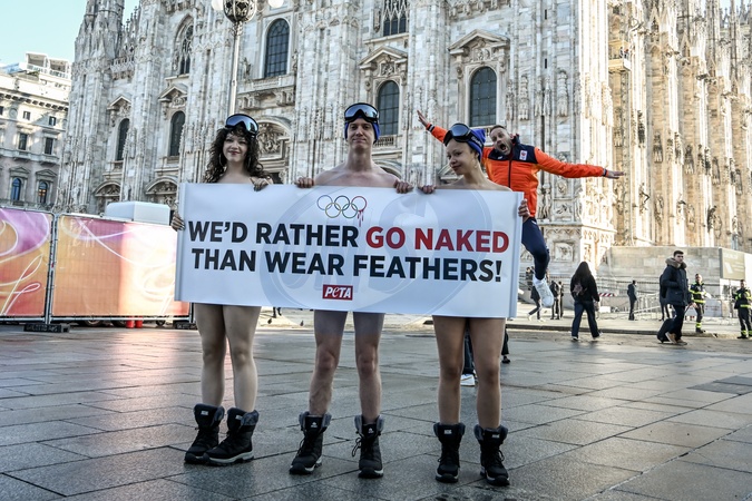 February 5, 2026, Milan. Piazza Duomo. Better Naked Than Wear Feathers, PETA's protest before the Olympics. A trio of nearly naked PETA supporters—wearing only hats, ski goggles, and snow boots—stand behind a banner reading "We'd Rather Go Naked Than Wear Feathers!", Credit:Nicola Marfisi / Avalon