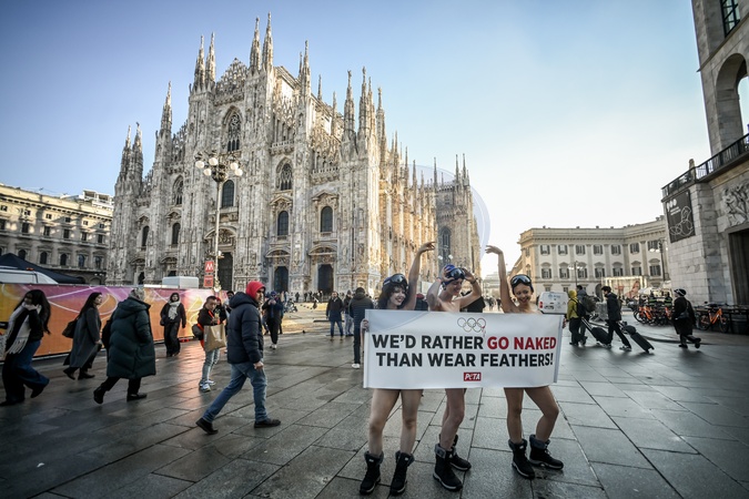 February 5, 2026, Milan. Piazza Duomo. Better Naked Than Wear Feathers, PETA's protest before the Olympics. A trio of nearly naked PETA supporters—wearing only hats, ski goggles, and snow boots—stand behind a banner reading "We'd Rather Go Naked Than Wear Feathers!", Credit:Nicola Marfisi / Avalon