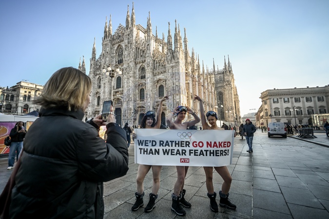 February 5, 2026, Milan. Piazza Duomo. Better Naked Than Wear Feathers, PETA's protest before the Olympics. A trio of nearly naked PETA supporters—wearing only hats, ski goggles, and snow boots—stand behind a banner reading "We'd Rather Go Naked Than Wear Feathers!", Credit:Nicola Marfisi / Avalon