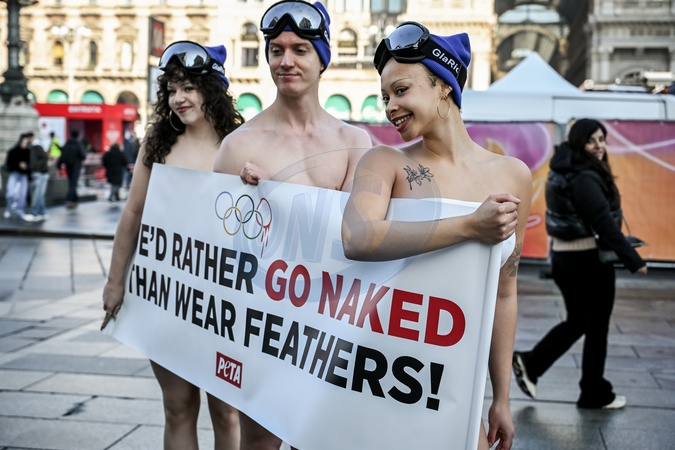 February 5, 2026, Milan. Piazza Duomo. Better Naked Than Wear Feathers, PETA's protest before the Olympics. A trio of nearly naked PETA supporters—wearing only hats, ski goggles, and snow boots—stand behind a banner reading "We'd Rather Go Naked Than Wear Feathers!", Credit:Nicola Marfisi / Avalon