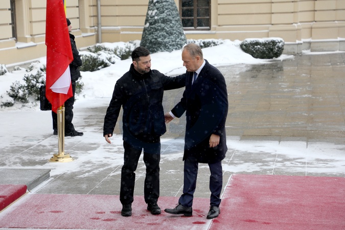 President of Ukraine Volodymyr Zelenskyy (L) welcomes Prime Minister of the Republic of Poland Donald Tusk at the entrance to the Mariinskyi Palace during the Polish leader's official visit to Kyiv, Ukraine, on February 5, 2026, Credit:Yuliia Ovsiannikova / Avalon