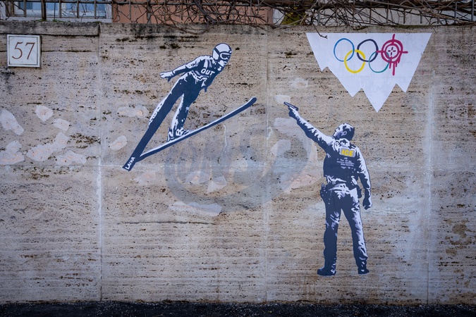 "Ice Out!" is the new mural by street artist LAIKA: a denunciation of the presence of the American anti-immigration agency at the Olympic Games in Milan-Cortina, Rome, Italy, on 06 February 2026.