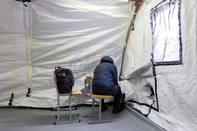 A woman gets warm in a mobile heating tent deployed by the State Emergency Service in response to electricity and heating shortages caused by Russian strikes on Ukraine's energy facilities in the Dniprovskyi district, Kyiv, Ukraine, February 6, 2026. On the night of February 3, Russian troops attacked the Darnytska CHP with five ballistic missiles, critically damaging the facility and forcing its shutdown. As a result, more than 1,100 residential buildings in the Dniprovskyi and Darnytskyi districts were left without heating., Credit:Kyrylo Chubotin / Avalon