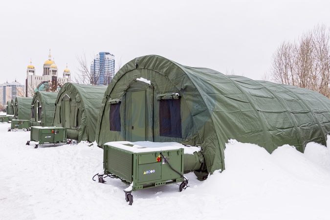 Mobile heating tents deployed by the State Emergency Service in response to electricity and heating shortages caused by Russian strikes on Ukraine's energy facilities stand near the Greek Catholic Cathedral of the Resurrection of Christ in the Dniprovskyi district, Kyiv, Ukraine, February 6, 2026. On the night of February 3, Russian troops attacked the Darnytska CHP with five ballistic missiles, critically damaging the facility and forcing its shutdown. As a result, more than 1,100 residential buildings in the Dniprovskyi and Darnytskyi districts were left without heating., Credit:Kyrylo Chubotin / Avalon