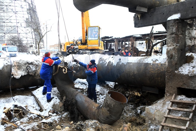 Workers get ready to lift a section of a pipe at Kyiv CHPP-4, severely damaged in a massive Russian missile attack, Kyiv, Ukraine, February 6, 2026. On the night of February 2–3, Russian forces struck the heating system of Kyiv CHPP-4 (Darnytska CHPP) with five ballistic missiles, causing critical damage and forcing its shutdown. As a result, 1,129 residential buildings in Dniprovskyi and part of Darnytskyi districts, along with 46 schools, 72 kindergartens, 18 medical institutions, and other social and urban infrastructure facilities, were left without heating and hot water amid temperatures of –25°C., Credit:Volodymyr Tarasov / Avalon