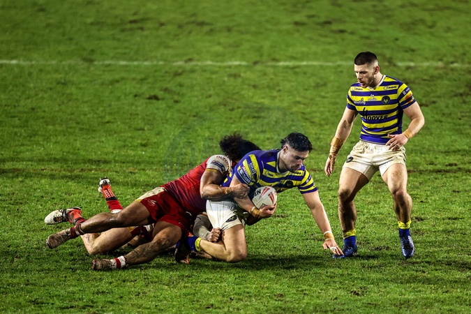 Joe Philbin of Warrington Wolves is tackled during the Betfred Challenge Cup match Warrington Wolves vs Sheffield Eagles at The Halliwell Jones Stadium, Warrington, United Kingdom on 06 February 2026, Credit:Ae Cosgrove/News Images / Avalon