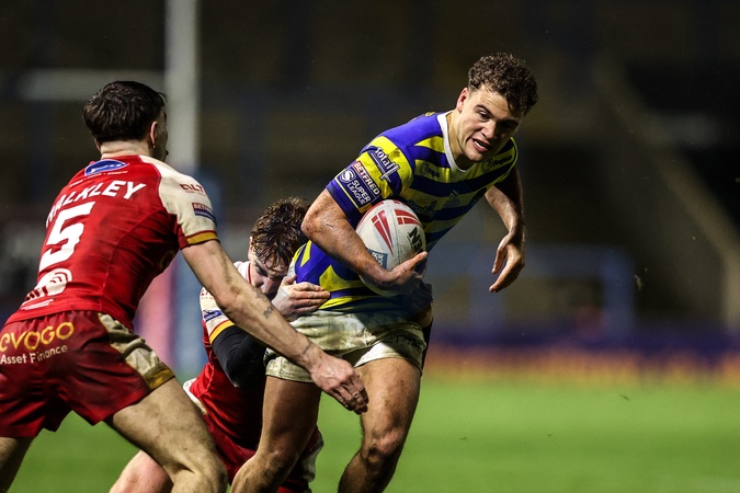 Cai Taylor-Wray of Warrington Wolves is tackled during the Betfred Challenge Cup match Warrington Wolves vs Sheffield Eagles at The Halliwell Jones Stadium, Warrington, United Kingdom on 06 February 2026, Credit:Ae Cosgrove/News Images / Avalon