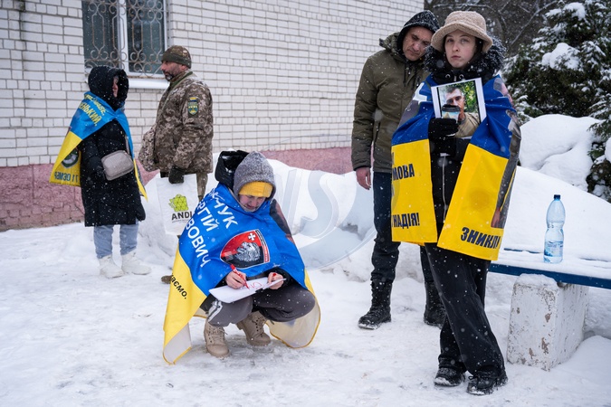 Women hold photographs of Ukrainian prisoners of war or those missing in action on a building wall so that Ukrainian servicemen and civilians released from Russian captivity can recognize them and provide information to families, Ukraine, on February 5, 2026. Ukraine has returned 157 Ukrainians from Russian captivity, including both military personnel and civilians, most of whom had been held since 2022, Credit:Danylo Antoniuk / Avalon