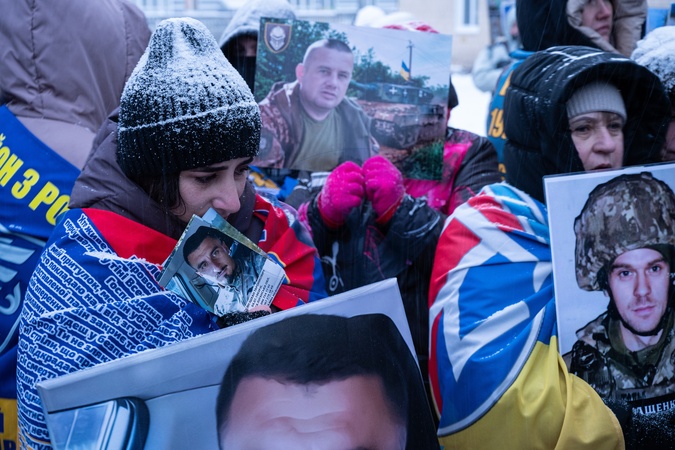 Women hold photographs of Ukrainian prisoners of war or those missing in action on a building wall so that Ukrainian servicemen and civilians released from Russian captivity can recognize them and provide information to families, Ukraine, on February 5, 2026. Ukraine has returned 157 Ukrainians from Russian captivity, including both military personnel and civilians, most of whom had been held since 2022, Credit:Danylo Antoniuk / Avalon