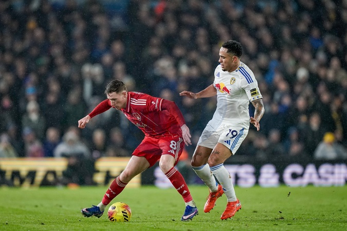 Elliot Anderson of Nottingham Forest shields the ball away from Noah Okafor of Leeds United during the Premier League match Leeds United vs Nottingham Forest at Elland Road, Leeds, United Kingdom on 06 February 2026, Credit:Maynard Manyowa/News Images / Avalon