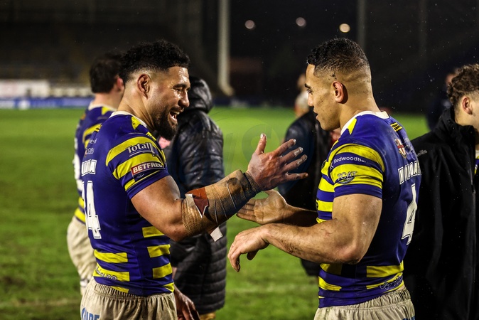 Kelepi Tanginoa of Warrington Wolves and Albert Hopoate of Warrington Wolves after the game during the Betfred Challenge Cup match Warrington Wolves vs Sheffield Eagles at The Halliwell Jones Stadium, Warrington, United Kingdom on 06 February 2026, Credit:Ae Cosgrove/News Images / Avalon