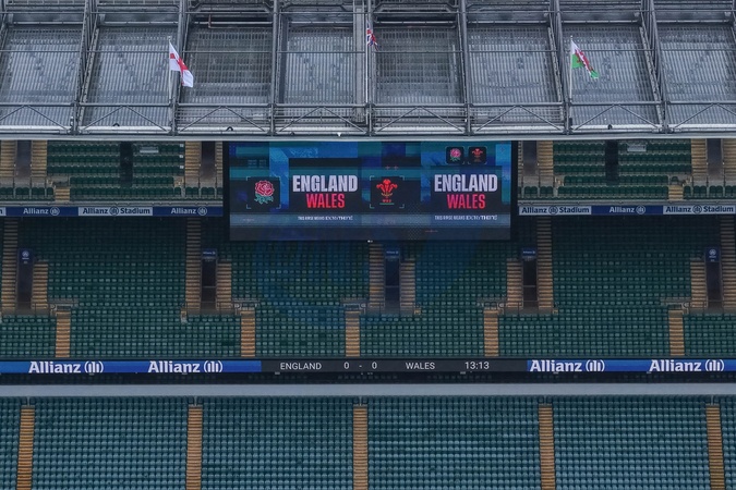An aerial view of The Allianz Stadium and the LED score board during the Guinness Six Nations 2026 match England vs Wales at Allianz Stadium, Twickenham, United Kingdom on 07 February 2026, Credit:Mark Cosgrove/News Images / Avalon