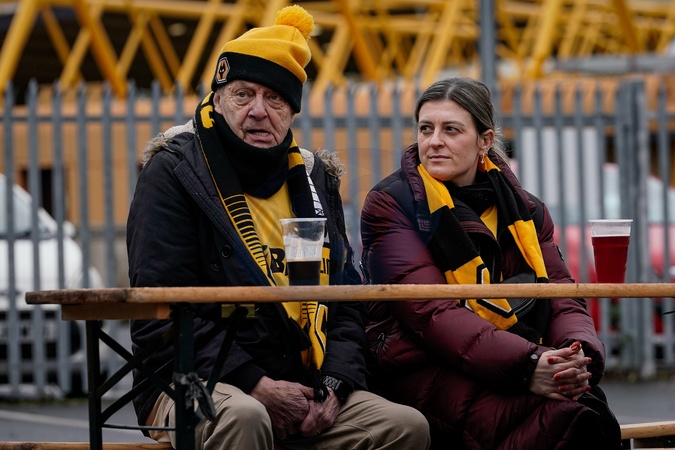 Wolverhampton fans sit in the fan zone outside the stadium prior to kick off during the Premier League match Wolverhampton Wanderers vs Chelsea at Molineux, Wolverhampton, United Kingdom on 07 February 2026, Credit:Maynard Manyowa/News Images / Avalon