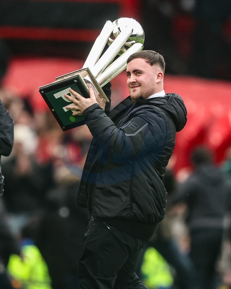 Luke ‘The Nuke' Littler shows his PDC World Championship trophy after winning it for his second consecutive year during the Premier League match Manchester United vs Tottenham Hotspur at Old Trafford, Manchester, United Kingdom on 07 February 2026, Credit:Ae Cosgrove/News Images / Avalon
