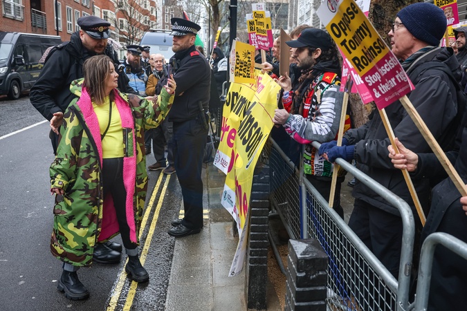 Supporters of Advance UK taunting anti-racism campaigners outside an event at the Emmanuel Centre in Westminster, London, UK, on 07 February 2026, as the party, backed by far-right activist Tommy Robinson, hold a policy launch event inside., Credit:Pete Speller / Avalon