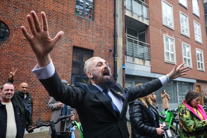 An evangelical preacher speaks to anti-racism protesters outside an Advance UK event at the Emmanuel Centre in Westminster, London, UK, on 07 February 2026, as the party, backed by far-right activist Tommy Robinson, hold a policy launch event inside., Credit:Pete Speller / Avalon