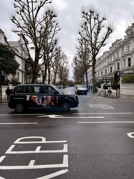 London, UK. 7 February 2026. A London black cab taxi displaying commercial advertising drives along a residential street in Kensington, west London., Credit:Alexander Seale / Avalon