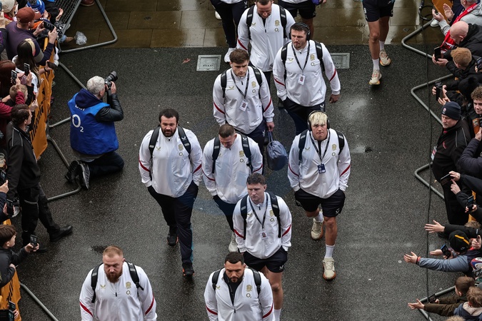 Henry Pollock of England arrives with team mates during the Guinness Six Nations 2026 match England vs Wales at Allianz Stadium, Twickenham, United Kingdom on 07 February 2026, Credit:Mark Cosgrove/News Images / Avalon