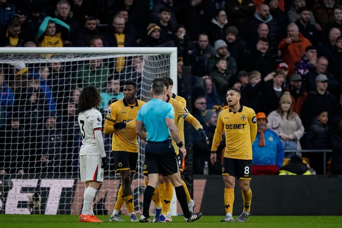 Wolves players contest a penalty decision by Referee Jarred Gillett during the Premier League match Wolverhampton Wanderers vs Chelsea at Molineux, Wolverhampton, United Kingdom on 07 February 2026, Credit:Maynard Manyowa/News Images / Avalon
