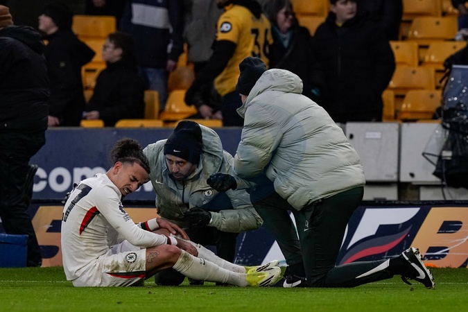 Malo Gusto of Chelsea receives treatment during the Premier League match Wolverhampton Wanderers vs Chelsea at Molineux, Wolverhampton, United Kingdom on 07 February 2026, Credit:Maynard Manyowa/News Images / Avalon