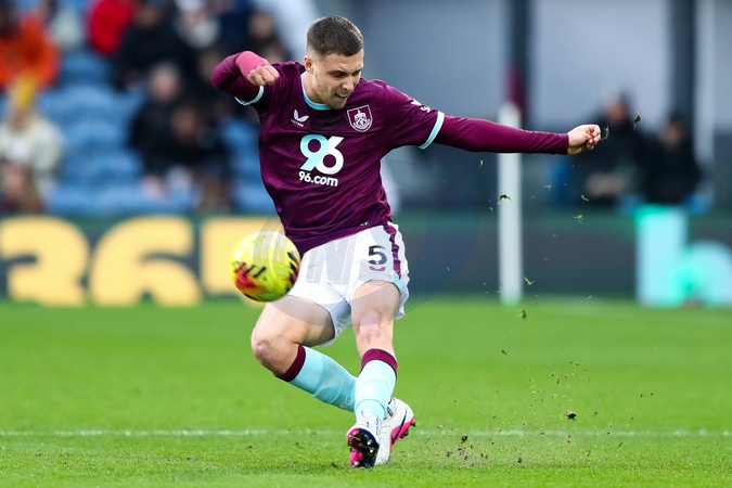 Maxime Esteve of Burnley passes the ball forward during the Premier League match Burnley vs West Ham United at Turf Moor, Burnley, United Kingdom on 07 February 2026, Credit:Jorge Horsted/News Images / Avalon
