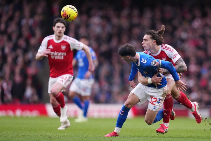 Riccardo Calafiori of Arsenal pulls down Trai Hume of Sunderland during the Premier League match Arsenal vs Sunderland at Emirates, London, United Kingdom on 07 February 2026, Credit:Harvey Murphy/News Images / Avalon