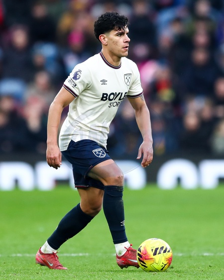 Mateus Fernandes of West Ham United passes the ball during the Premier League match Burnley vs West Ham United at Turf Moor, Burnley, United Kingdom on 07 February 2026, Credit:Jorge Horsted/News Images / Avalon