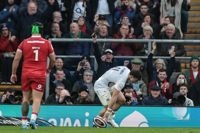 Henry Arundell of England goes over for a try during the Guinness Six Nations 2026 match England vs Wales at Allianz Stadium, Twickenham, United Kingdom on 07 February 2026, Credit:Mark Cosgrove/News Images / Avalon