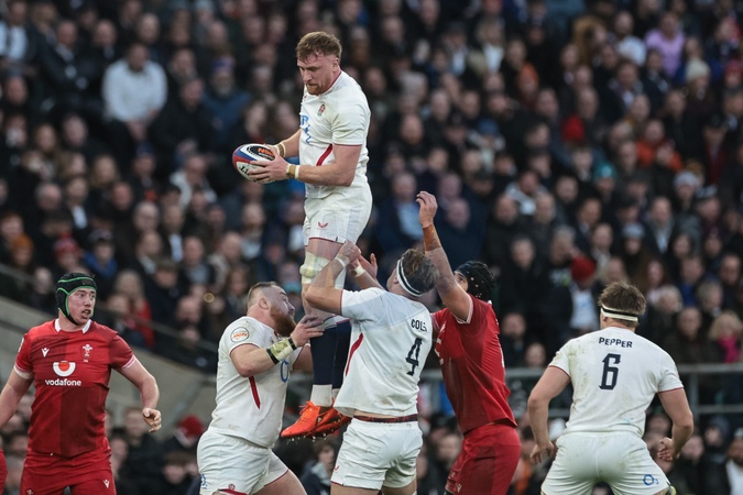 Ollie Chessum of England wins the jumps up to win the ball in a lineout during the Guinness Six Nations 2026 match England vs Wales at Allianz Stadium, Twickenham, United Kingdom on 07 February 2026, Credit:Mark Cosgrove/News Images / Avalon