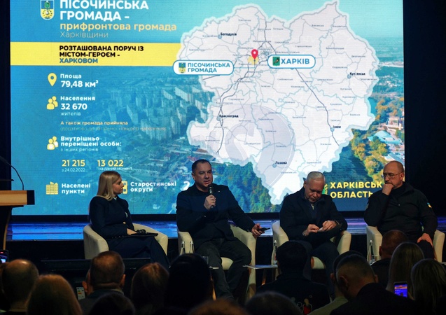 Pisochyn settlement head Oleh Chernobai (2nd L), chairman of the Association of Frontline Cities and Communities and Kharkiv city head Ihor Terekhov (2nd R) and First Deputy Prime Minister of Ukraine and Minister of Energy of Ukraine Denys Shmyhal (R) participate in a panel discussion at the Forum of Frontline Cities and Communities "Resilience, Recovery, Development: Vision of Frontline Communities - 2026,” Kharkiv, Ukraine, on February 5, 2026., Credit:Viacheslav Madiievskyi / Avalon
