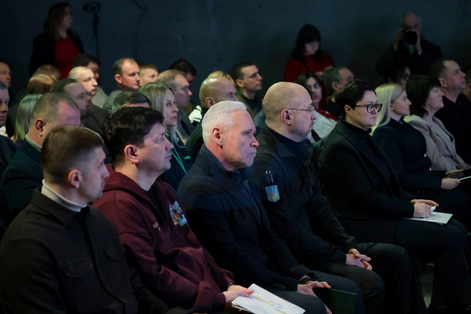 Mykolaiv Regional Military Administration head Vitalii Kim, chairman of the Association of Frontline Cities and Communities and Kharkiv city head Ihor Terekhov and First Deputy Prime Minister of Ukraine and Minister of Energy of Ukraine Denys Shmyhal (L to R, middle) participate the Forum of Frontline Cities and Communities "Resilience, Recovery, Development: Vision of Frontline Communities - 2026,” Kharkiv, Ukraine, on February 5, 2026., Credit:Viacheslav Madiievskyi / Avalon