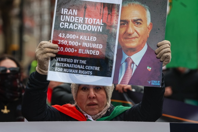Protesters march through central London before gathering outside Downing Street in London, UK, on 07 February 2026, supporting the uprising in Iran and calling for the reinstatement of Crown Prince Reza Pahlavi., Credit:Pete Speller / Avalon