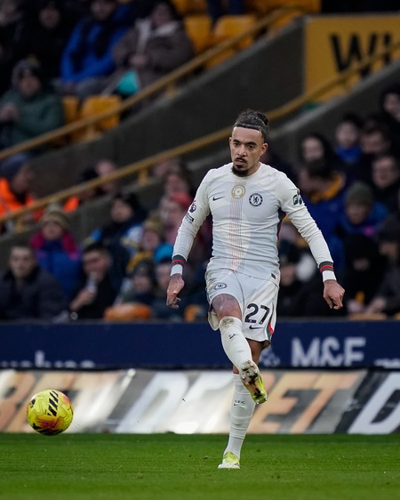 Malo Gusto of Chelsea passes the ball during the Premier League match Wolverhampton Wanderers vs Chelsea at Molineux, Wolverhampton, United Kingdom on 07 February 2026, Credit:Maynard Manyowa/News Images / Avalon