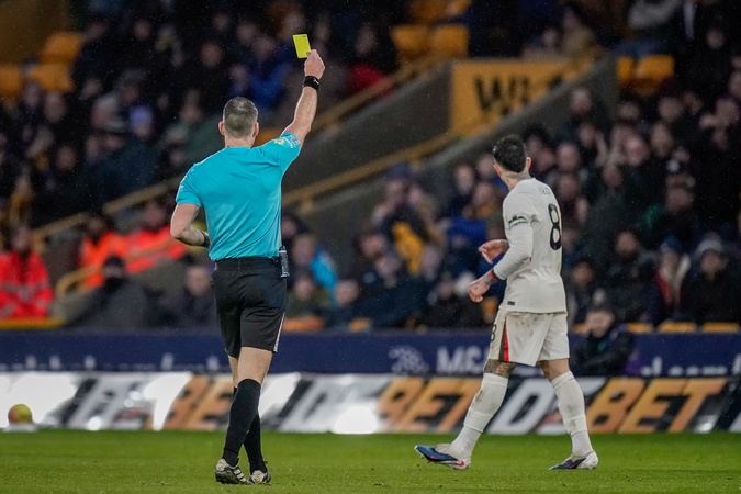 Referee Jarred Gillett gives a yellow card to Enzo Fernandez of Chelsea during the Premier League match Wolverhampton Wanderers vs Chelsea at Molineux, Wolverhampton, United Kingdom on 07 February 2026, Credit:Maynard Manyowa/News Images / Avalon