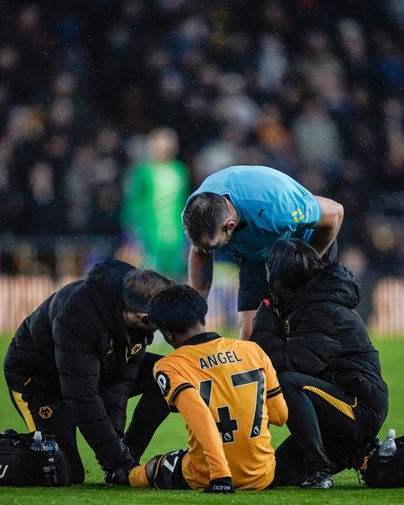 Angel Gomes of Wolverhampton Wanderers receives treatment during the Premier League match Wolverhampton Wanderers vs Chelsea at Molineux, Wolverhampton, United Kingdom on 07 February 2026, Credit:Maynard Manyowa/News Images / Avalon