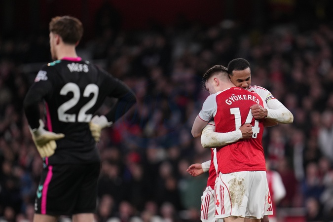 Gabriel of Arsenal and Viktor Gyokeres of Arsenal celebrate third goal during the Premier League match Arsenal vs Sunderland at Emirates, London, United Kingdom on 07 February 2026, Credit:Harvey Murphy/News Images / Avalon