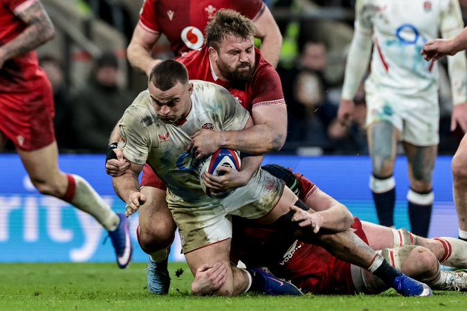 Ben Earl of England is tackled by Tomas Francis of Wales during the Guinness Six Nations 2026 match England vs Wales at Allianz Stadium, Twickenham, United Kingdom on 07 February 2026, Credit:Mark Cosgrove/News Images / Avalon