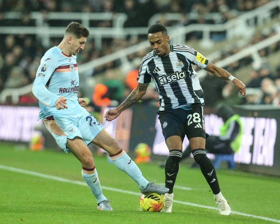Joe Willock of Newcastle United is tackled by Vitaly Janelt of Brentford during the Premier League match Newcastle Untied vs Brentford at St. James's Park, Newcastle, United Kingdom on 07 February 2026, Credit:Richard Bierton/News Images / Avalon