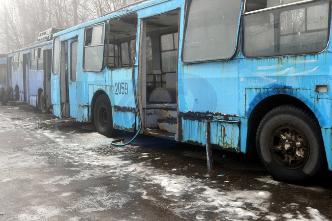 Trolleybuses are damaged by a Russian drone strike, Dnipro, Ukraine, February 7, 2026. On the night of February 7, the Russian army launched more than 400 drones and about 40 missiles across Ukraine, targeting energy and civil infrastructure. In Dnipro, 18 passenger trolleybuses, one service vehicle, and other transport were damaged at a depot, while administrative buildings and heating systems were also affected., Credit:Mykola Miakshykov / Avalon
