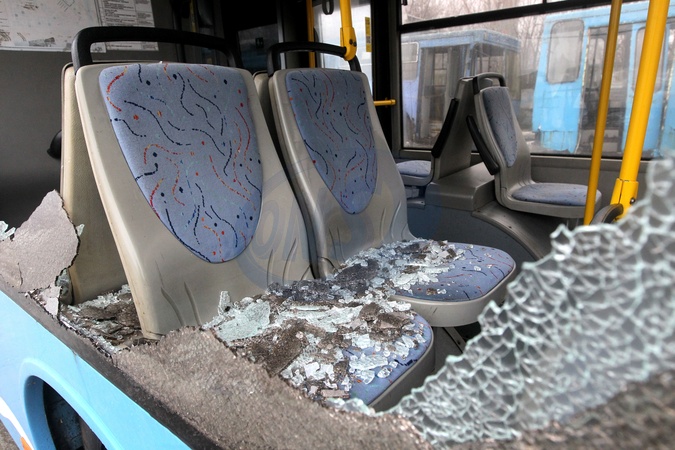 Glass shards cover the seat inside a trolleybus at a depot after a Russian drone strike, Dnipro, Ukraine, February 7, 2026. On the night of February 7, the Russian army launched more than 400 drones and about 40 missiles across Ukraine, targeting energy and civil infrastructure. In Dnipro, 18 passenger trolleybuses, one service vehicle, and other transport were damaged at a depot, while administrative buildings and heating systems were also affected., Credit:Mykola Miakshykov / Avalon