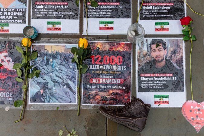 Trafalgar Square, London, UK. 7th February 2026.A 'Stop The Genocide' Exhibition to honour and remember those killed by the government of the Islamic Republic of Iran over the 47 years since the Islamic Revolution in 1979.Hundreds of photographs and personal objects were surrounded by candles and flowers.Many images included some of the estimated 90,000 killed during the current genocide by the regime; 12,000 - 36,500 of those are thought to have been killed over the Jan 8th-9th crackdown on the current protests., Credit:Photo by Amanda Rose / Avalon